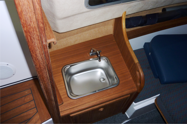 Druckwasserpumpe und 50 Liter Tank mit Niro-Waschbecken in der Kabine